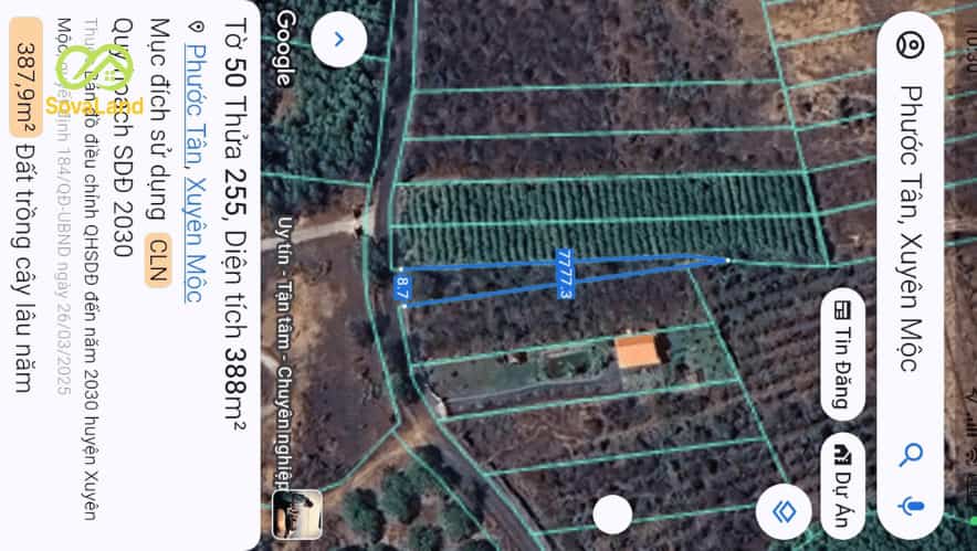 Diện tích 388m², đất CLN (cây lâu năm). Hiện mua bán bằng giấy tay, chờ quy định mới để làm sổ.
